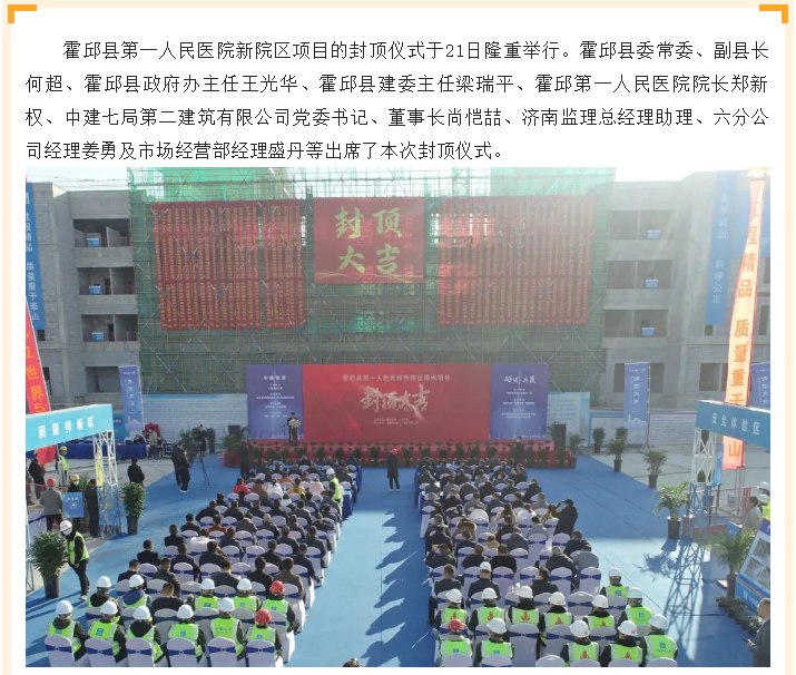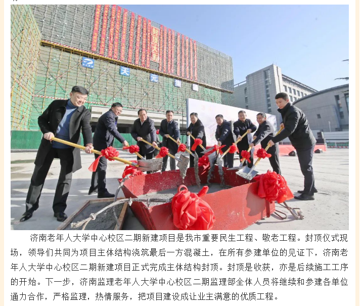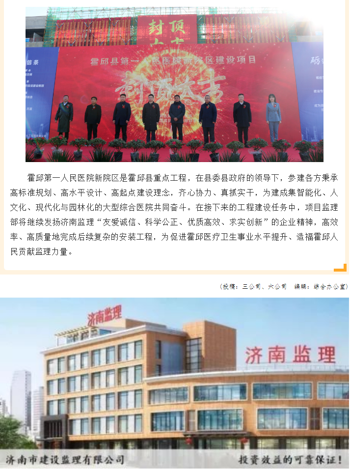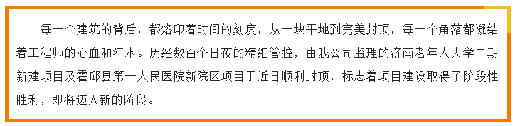 匠心傾注 喜封金頂——我公司監(jiān)理的濟(jì)南老年人大學(xué)二期新建項(xiàng)目及霍邱縣第一人民醫(yī)院新院區(qū)項(xiàng)目順利封頂
