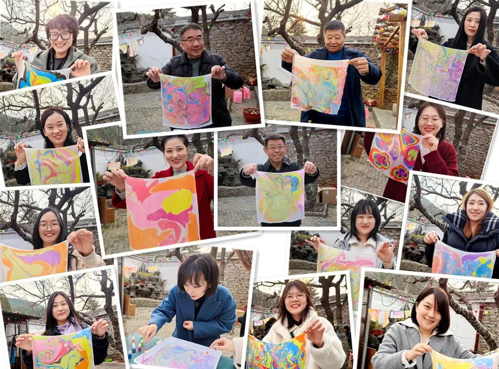 品嘗完甜蜜的糖葫蘆,大家又紛紛投入到水拓畫(huà)絲巾活動(dòng)中。創(chuàng)作、水拓、固色再到晾干,隨著一幅幅色彩斑斕的畫(huà)作拓印于絲巾之上,大家由衷地發(fā)出歡呼和贊嘆,欣賞著這份獨(dú)一無(wú)二的美,感受非物質(zhì)文化遺產(chǎn)水拓畫(huà)的獨(dú)特魅力。水拓絲巾的制作不僅考驗(yàn)著大家的耐心與細(xì)心,更是一次對(duì)美的追求與探索。